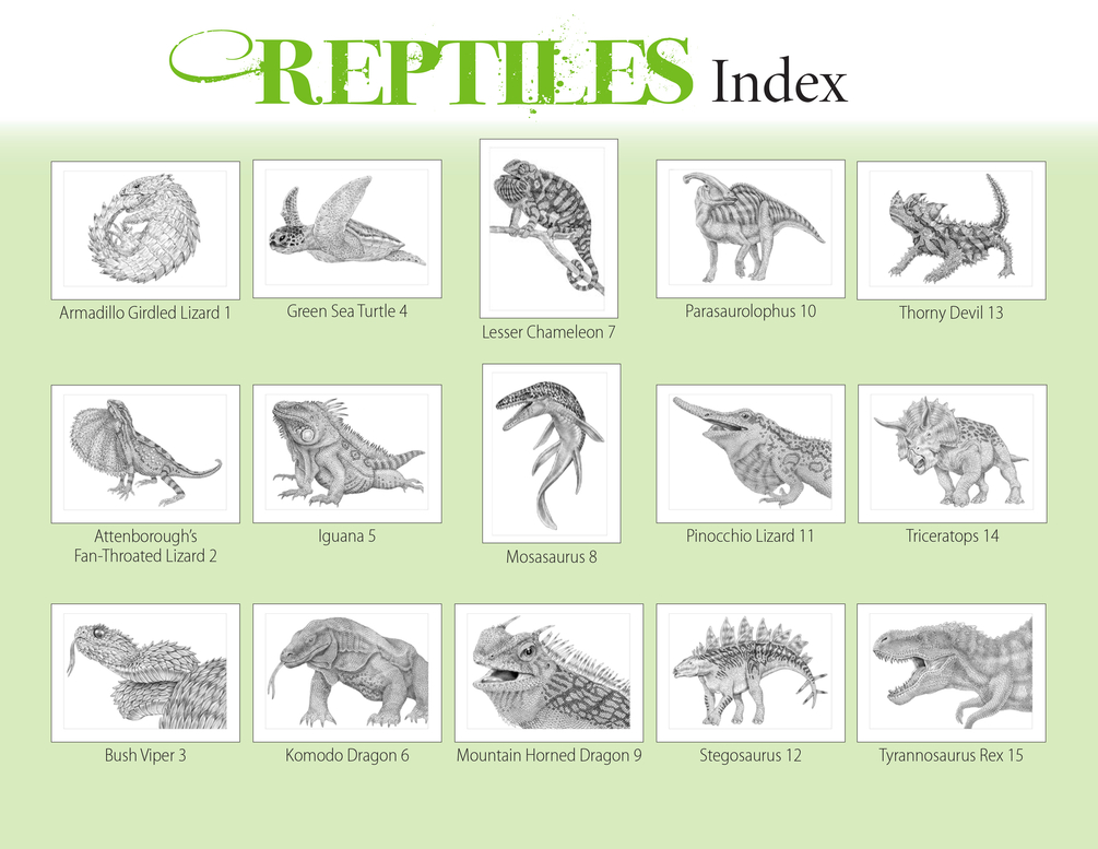 - Armadillo girdled lizard, Attenborough’s fan-throated lizard, Bush Viper, Green Sea Turtle, Iguana, Komodo Dragon, Lesser Chameleon, Mosasaurus, Mountain Horned Dragon, Parasaurolophus, Pinocchio Lizard, Stegosaurus, Thorny Devil, Triceratops, Tyrannosaurus Rex