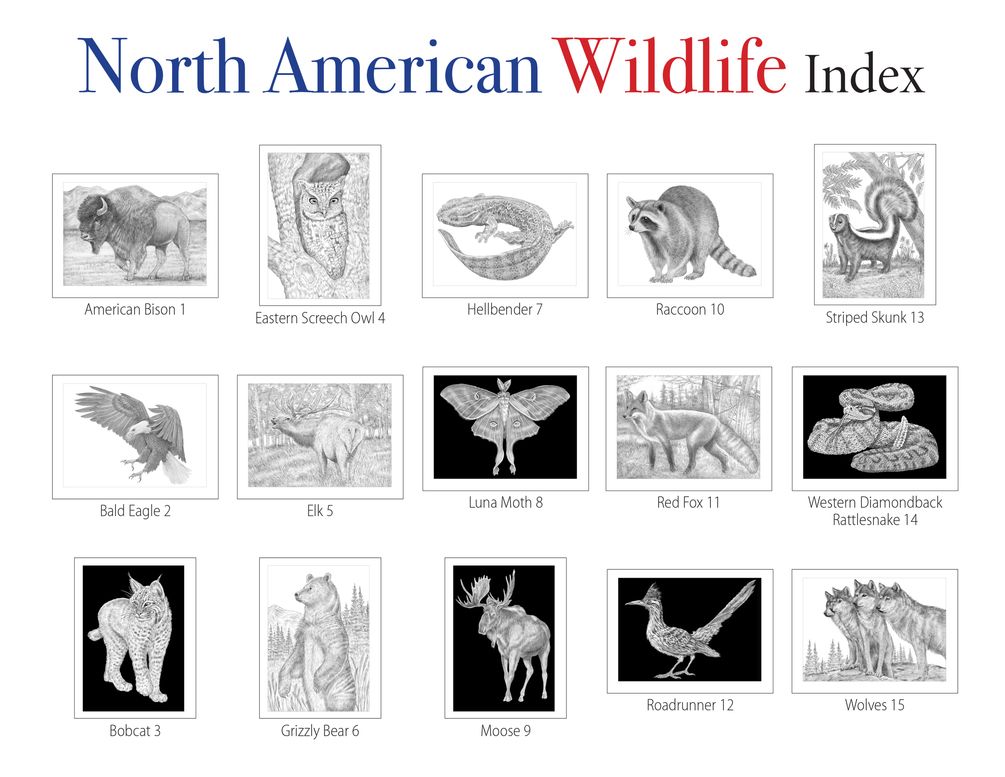 • American Bison • Bald Eagle • Bobcat • Eastern Screech Owl • Elk • Grizzly Bear • Hellbender • Luna Moth • Moose • Raccoon • Red Fox • Roadrunner • Striped Skunk • Western Diamondback Rattlesnake • Wolves