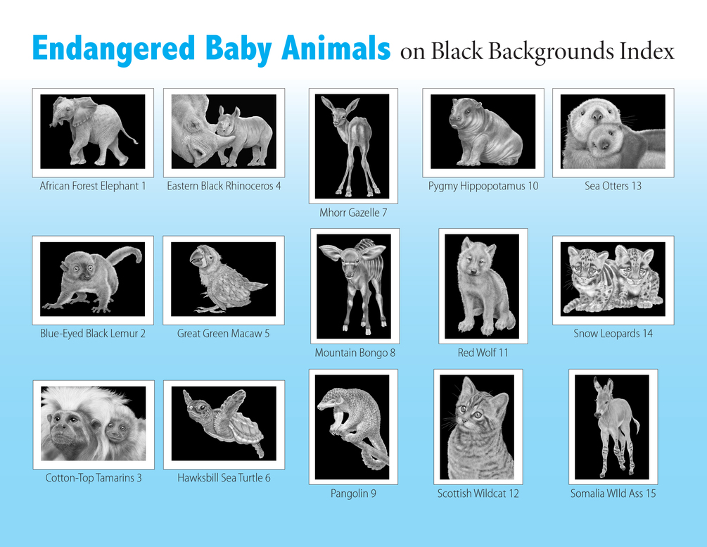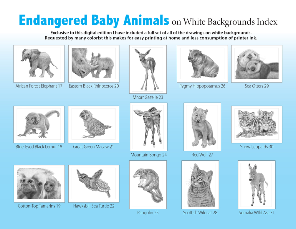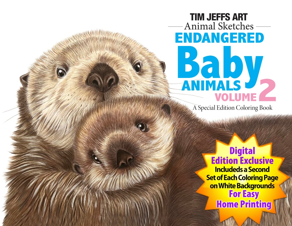 Endangered Baby Animals 2 Coloring Book includes unique coloring pages of 15 endangered baby animals along with a step-by-step coloring lesson of an adorable Mother Sea Otter and her Pup.